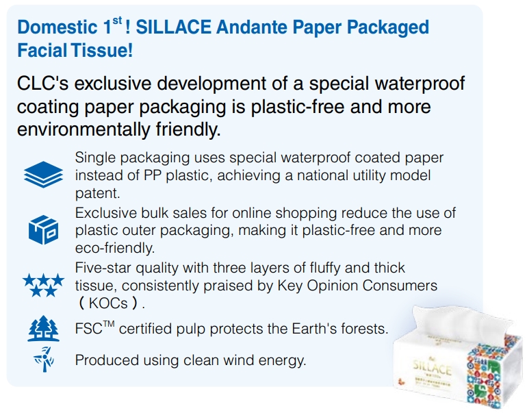Through constant process optimization, introduction of new technology and advanced equipment, including Taiwan’s 1st automated household tissue warehouse, Asia’s 1st millions Mt wind turbine, and enhance the R&D center to develop high-value and low carbon products to meet increasing consumer demand. In line with the global trend towards low-carbon and plastic reduction solutions rooted in nature, we developed the "SILLACE Andante Paper Packaged Facial Tissue" in 2023. Additionally, we launched products such as the "Dandelion Eco-Friendly Convenient Pack Tissue" and the "Andante Local Extract Facial Cleansing Series," offering diverse ways to help consumers easily practice environmental protection in their daily lives.