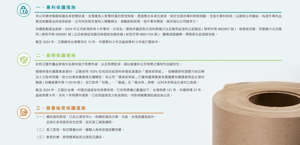 為完善智慧財產管理體系且持續精進,正隆設有專責單位協助智財管理事務之推動,保護研發成果與降低營運風險,同時鼓勵員工創新研發,作為各單位相關決策和執行準則。