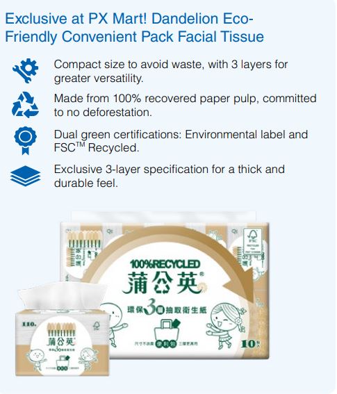 To further expand the market share of eco-friendly household paper, in 2023, an exclusive "Dandelion" convenient pack of eco-friendly facial tissue was launched at PX Mart, Taiwan's largest supermarket chain. This product targets eco-conscious and cost-saving consumers with its more economical size. Additionally, responding to the trend for large-pack facial tissues, an exclusive "Dandelion" 3-layer large pack (24 units) was developed for Carrefour, with a 20% increase in the number of tissues per pack, offering consumers a more cost-effective option. In 2023, sales of the Dandelion series exceeded 34 million packs, with increasing market penetration.