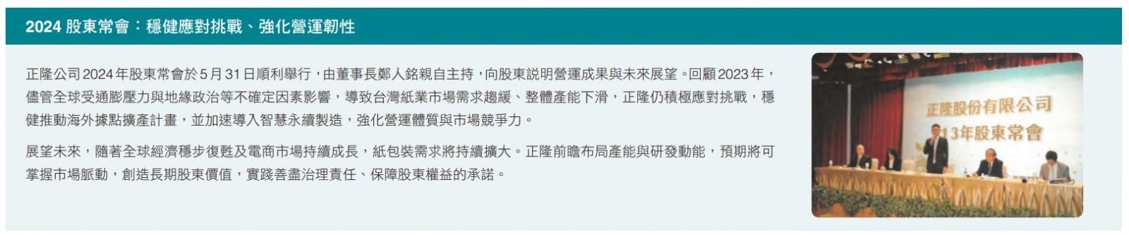 為提升資訊揭露品質並加強與重要利害關係人的溝通,正隆於2024年度舉辦兩場線上法說會(分別於 3 月 28 日 與 8 月 16 日),由總經理、事業部主管及發言人向投資人與媒體報告營運概況、投資計畫、營業展望、ESG 策略、 風險管理及行動成果。此外,公司亦積極參與國內外各大ESG評比,藉此檢視並提升資訊揭露品質,確保與利害關係人之間的透明溝通與信任